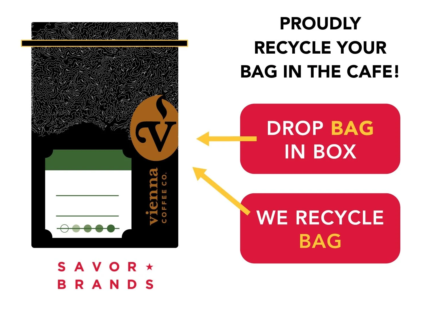 Look for the designated recycling boxes at the Vienna Coffee House. We cannot guarantee that all coffee bags are sourced to be recycled, so please limit to Vienna Coffee Bags.