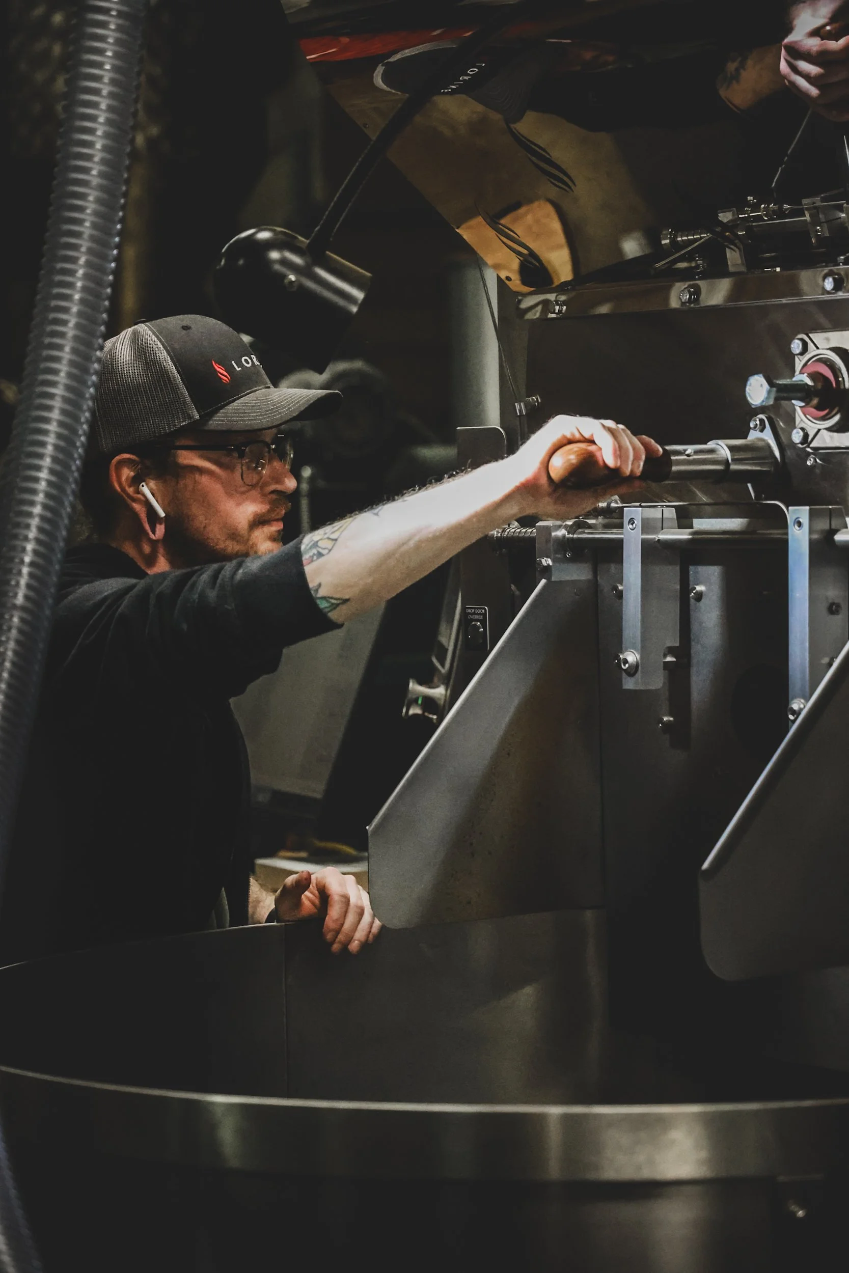 Trace checking the roast progress on our Loring Roaster, which roasts Vienna about 180,000 lbs of coffee a year.