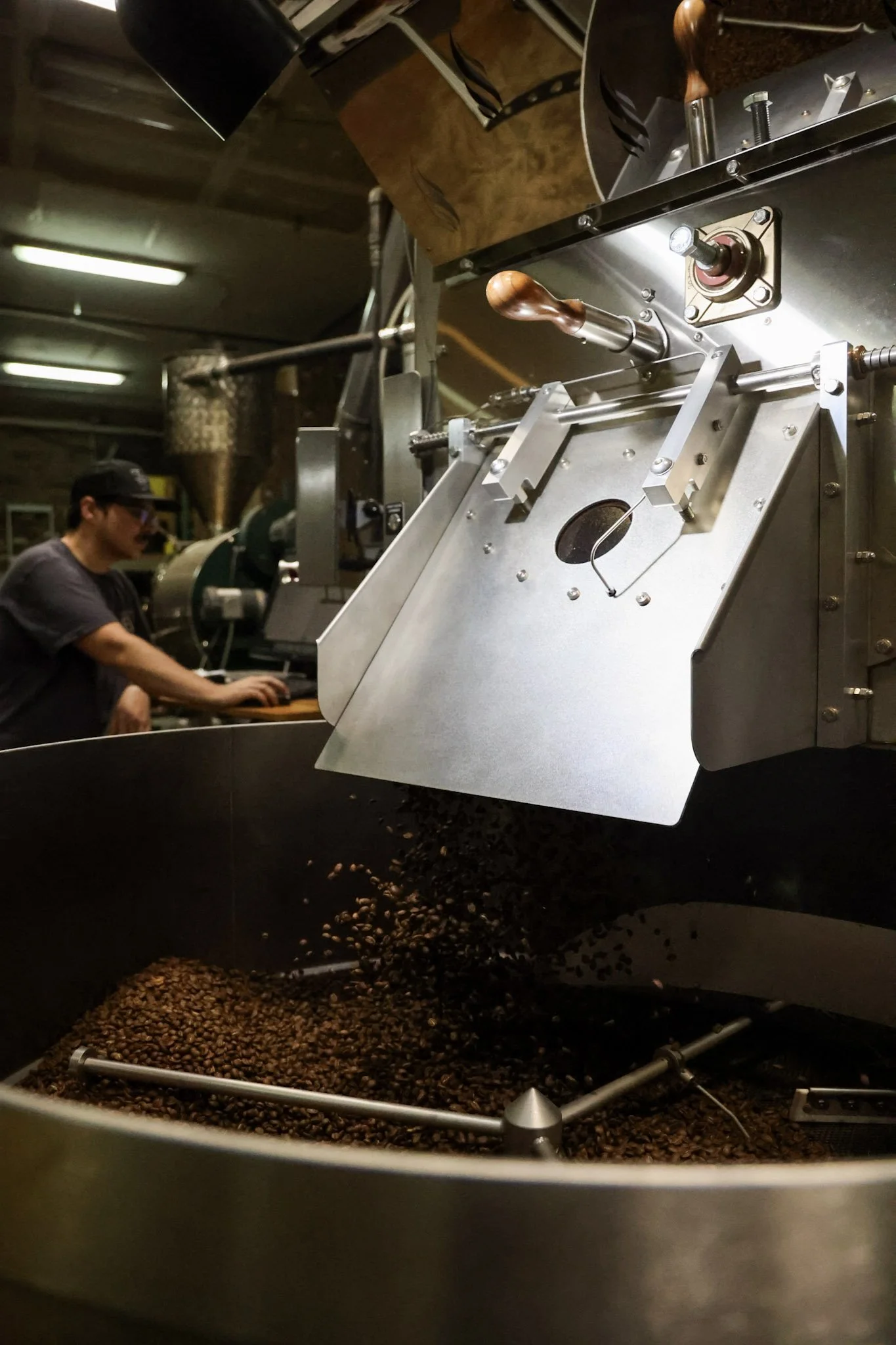 Trace checking the roast progress on our Loring Roaster, which roasts Vienna about 180,000 lbs of coffee a year.