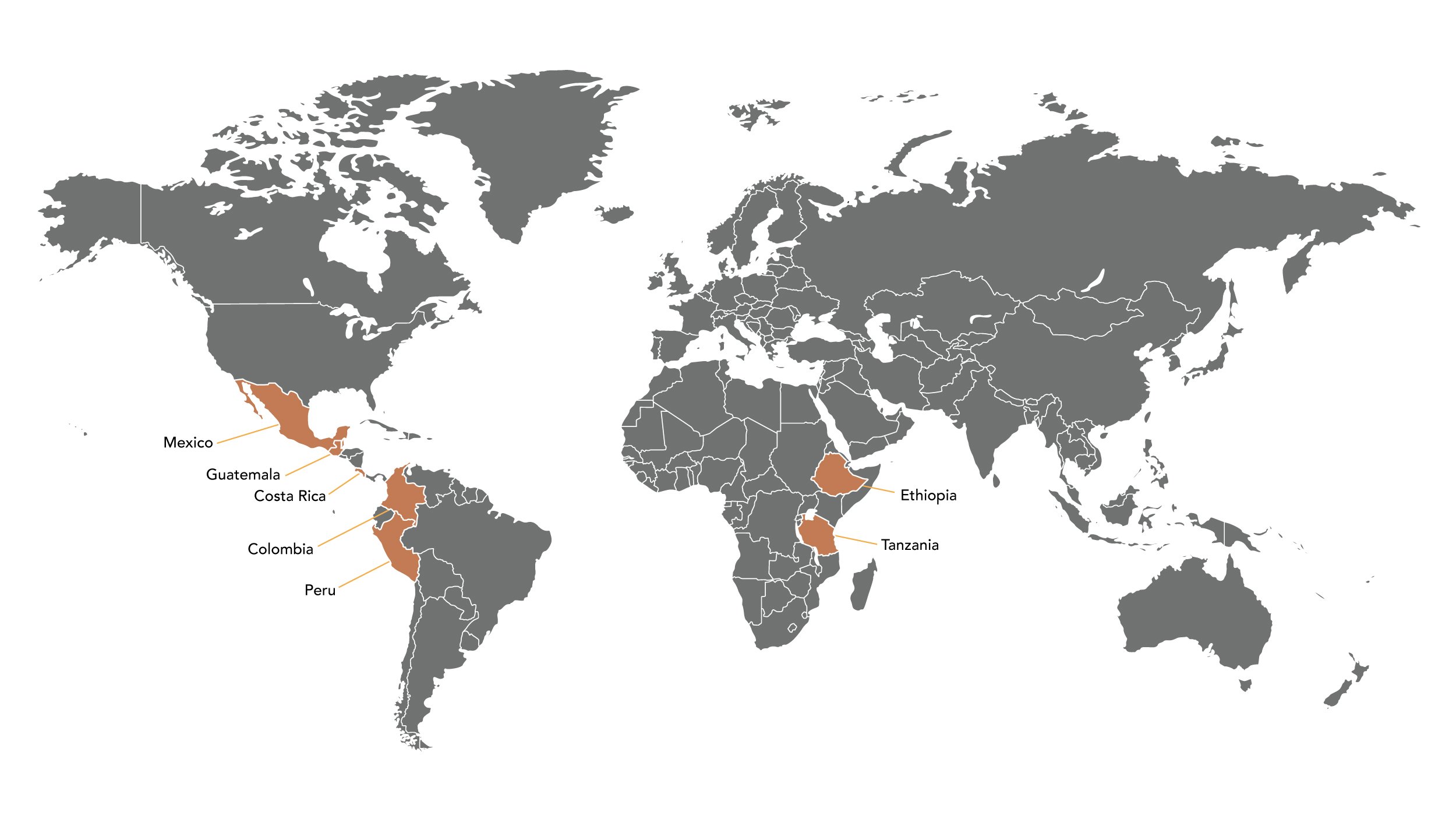 While our single origin selection changes regularly, this is a map of the countries where we currently source our single origin coffee from.