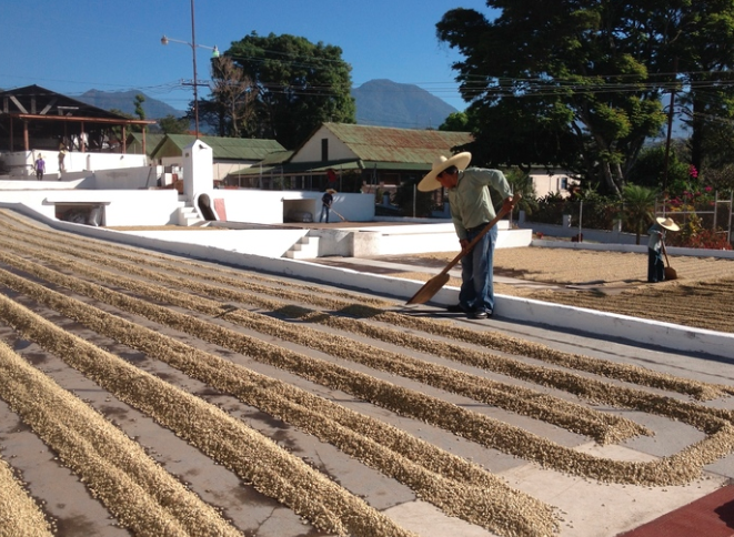 After the fruit of the coffee cherries has been removed, the coffee beans are put through a washing process and then spread out on cement patios to dry before being bagged and shipped to our roasting facility in Maryville.