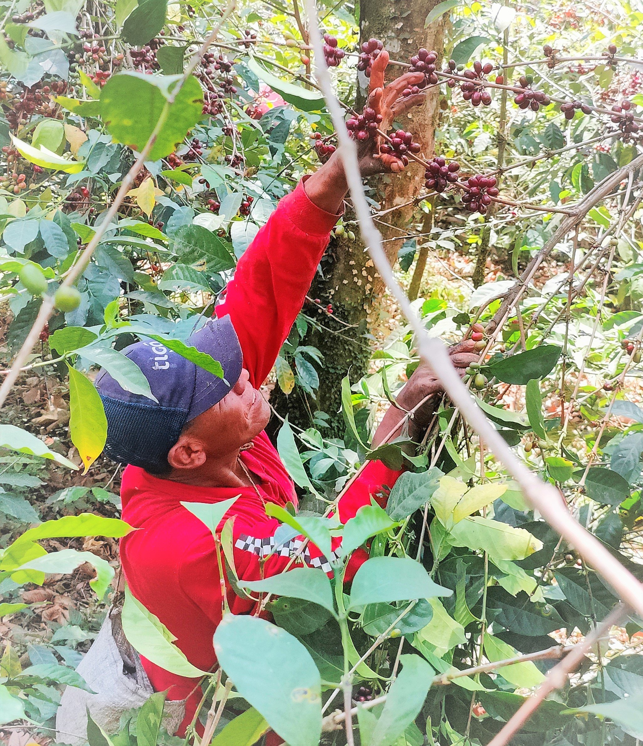 A worker at CECANOR cooperative hand-picking only the ripest coffee cherries for processing.