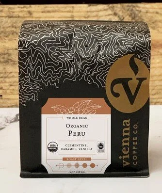 A bag of carefully picked, processed and packaged Organic Fair Trade Peruvian green coffee at Vienna Coffee Company getting ready for the roaster to become June’s featured coffee!